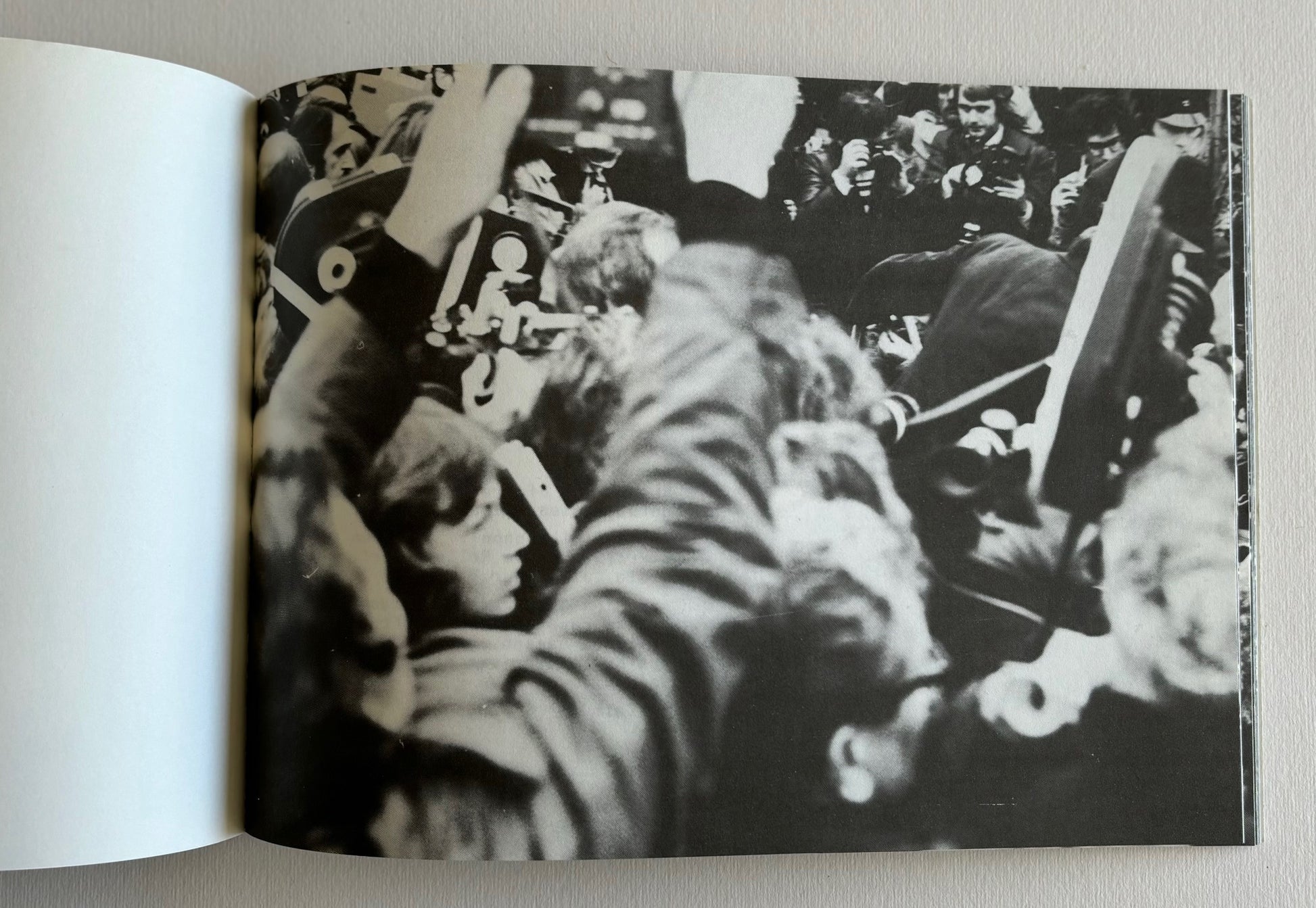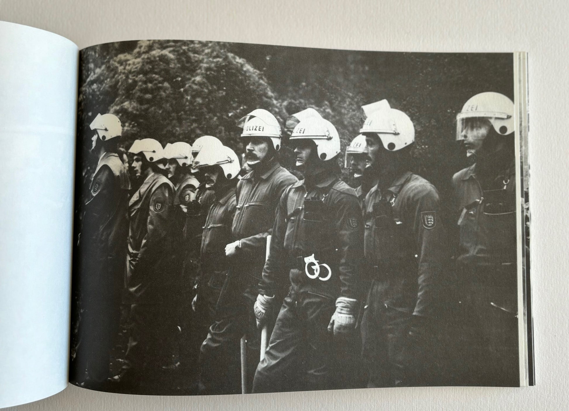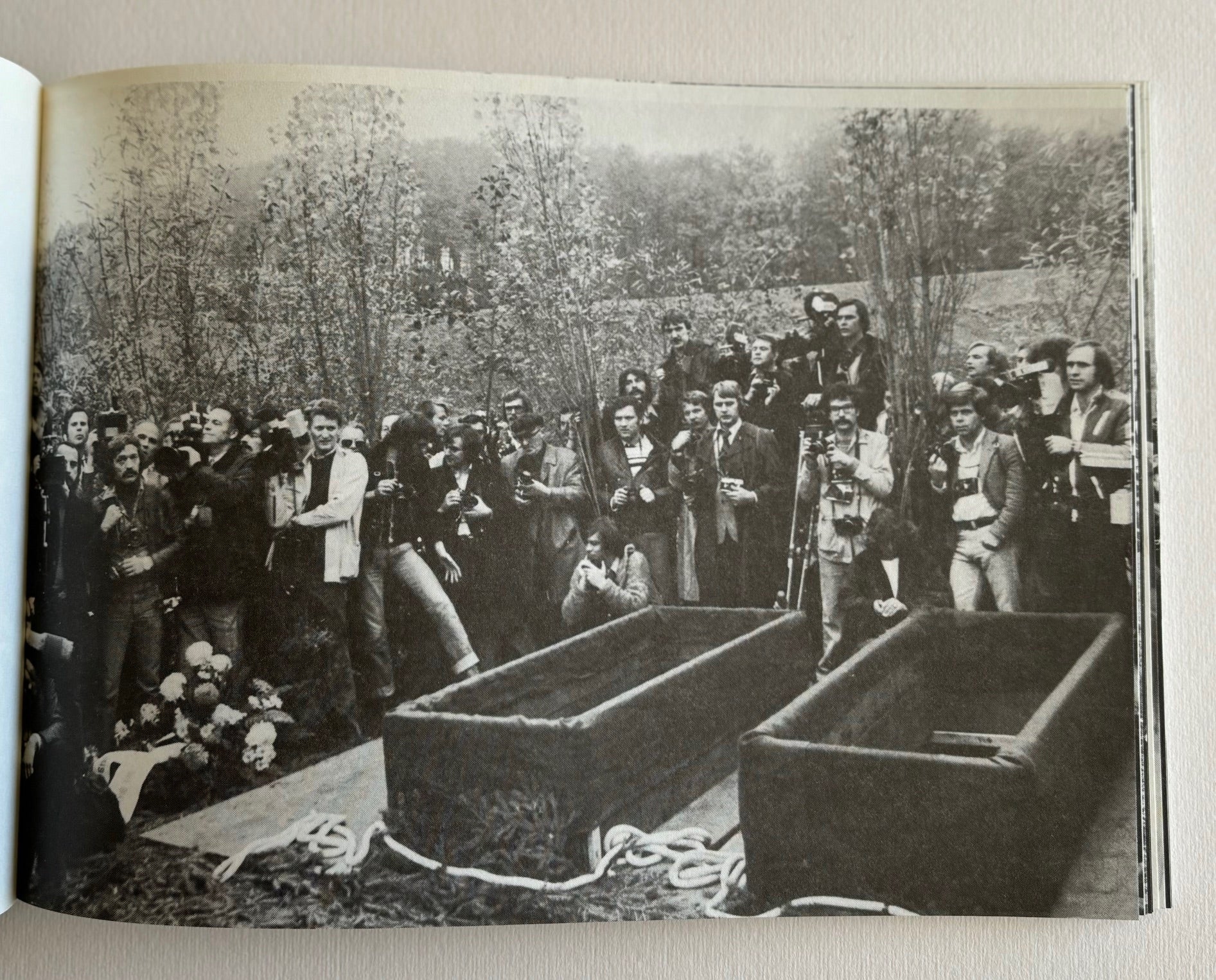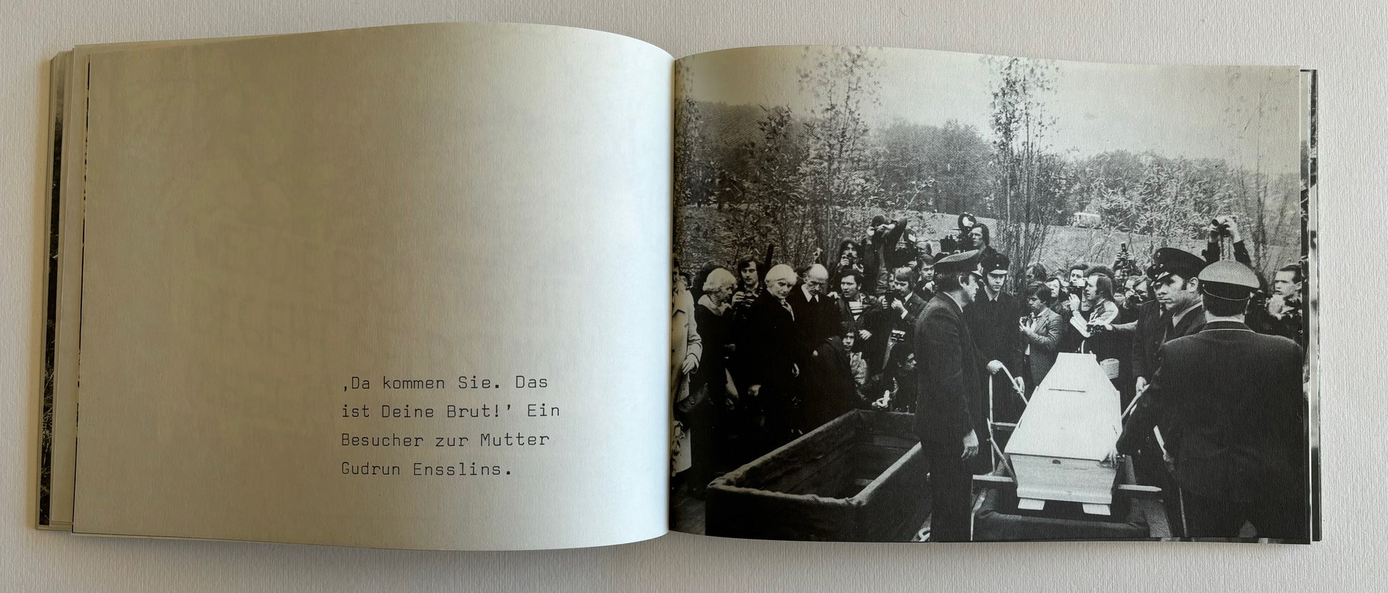 30 black & white photos of the funeral of Andreas Baader, Gudrun Ensslin and Jan-Carl Raspe in Stuttgart on the 27-th of October 1977. DANS shows the invasion of the press at the cemetery and the police force also present for this funeral of three of the main figures of the Rote Armee Fraktion. All three imprisoned in Stammheim near Stuttgart, committed, according to the German authorities, suicide in their cells in the night of the 18-th of October, the day a German special units put an end to a plane hijacking in Mogadishu, intended to achieve the release of the leaders of the Baader-Meinhof movement in Stammheim. Text by Lothar Beck and Max Dans. ‘Der Deutsche Herbst’.