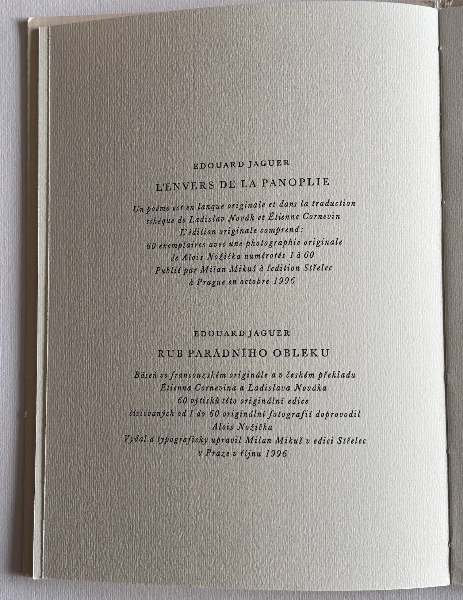 First edition of 60, numbered copies only. A black & white photograph (240 x 170 mm.) from 1962, signed and numbered at the back side by Alois NOZICKA + a poem from 1967 by Edouard JAGUER - “L’ envers de la Panoplie” – in French and in a Czech translation.
