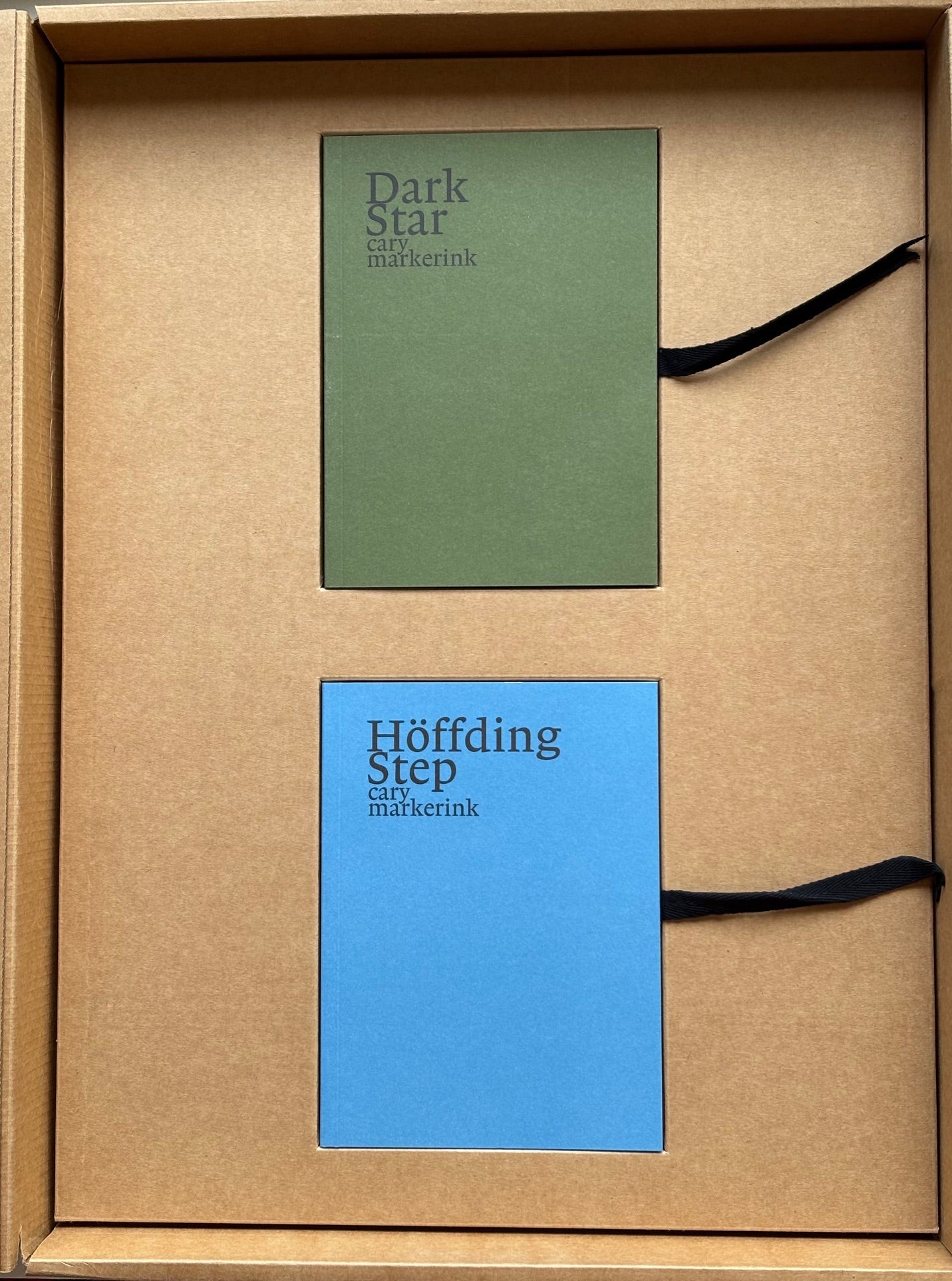 Black silk covered boards + two softcover booklets: Höffding Step, a novella in English about an international scam in historical photos, an indirect critique of photography becoming Art..., written by MARKERINK himself. and Dark Star. Chernobyl. the Exclusion Zone - with a collection of portraits found by MARKERINK in Chernobyl. The three publication in the original printed cardboard box in another publisher’s cardboard box.
