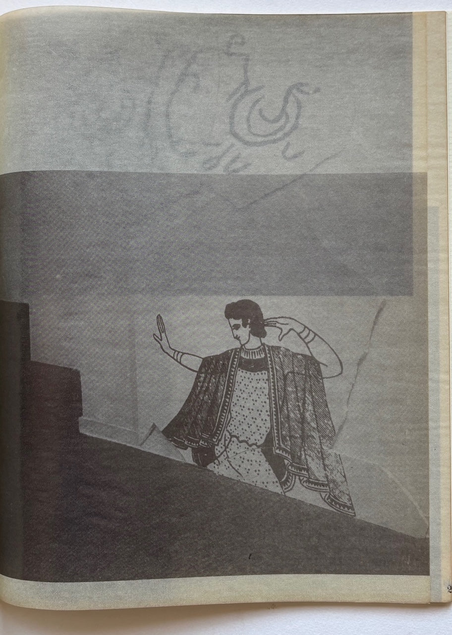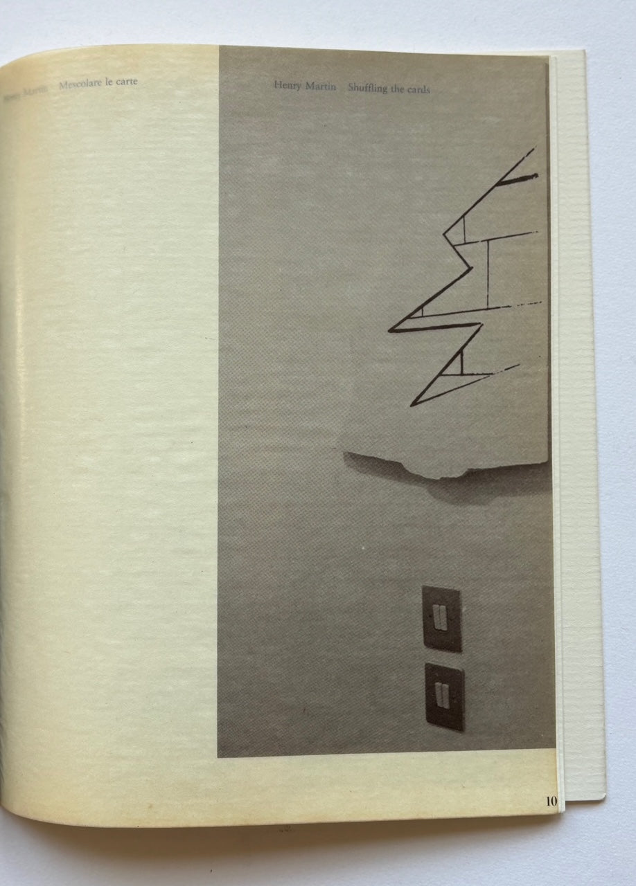 Complete with a little image pasted on cardboard and a loose bookmark, specially designed by the Italian artist. 16 black & white images “of fragments of images on fragments of plaster” – taken by Piero CASADEI and Giampaolo OSSANI - printed on on transparent tissue paper. And a loose printed oblong sheet with four sheets of different stock an color, of which three have been “each a little more consumed than the one that follows it so that as far as their colors are concerned they’re all visible all at once”, from Mescolare le carte/Shuffling the cards, text in Italian and English by Henry Martin. Designed by Alvaro BECCATINI. O la biblioteca di Don Chisciotte, introduction in Italian and English by Emilio MATTIOLI and Franco GUERZON.