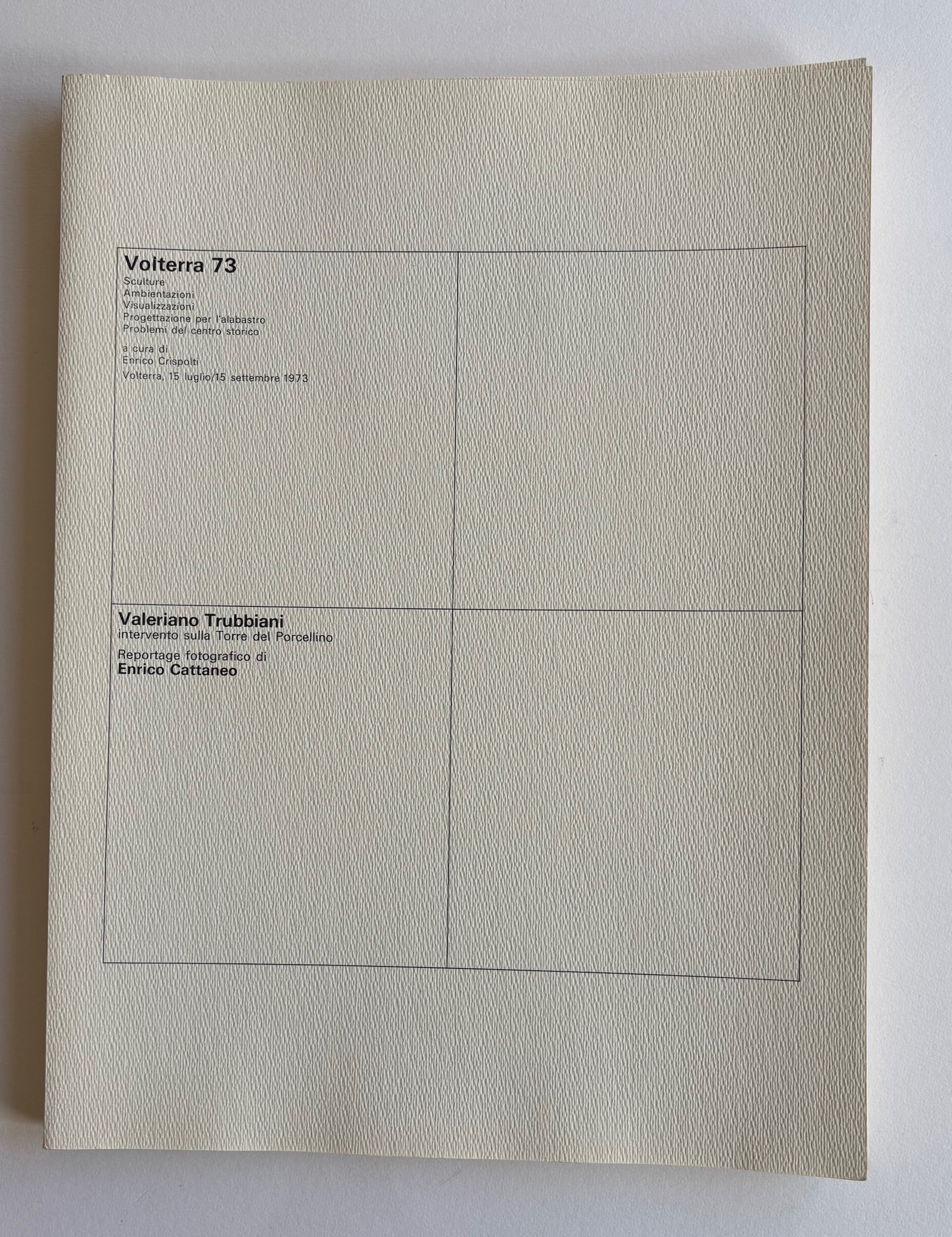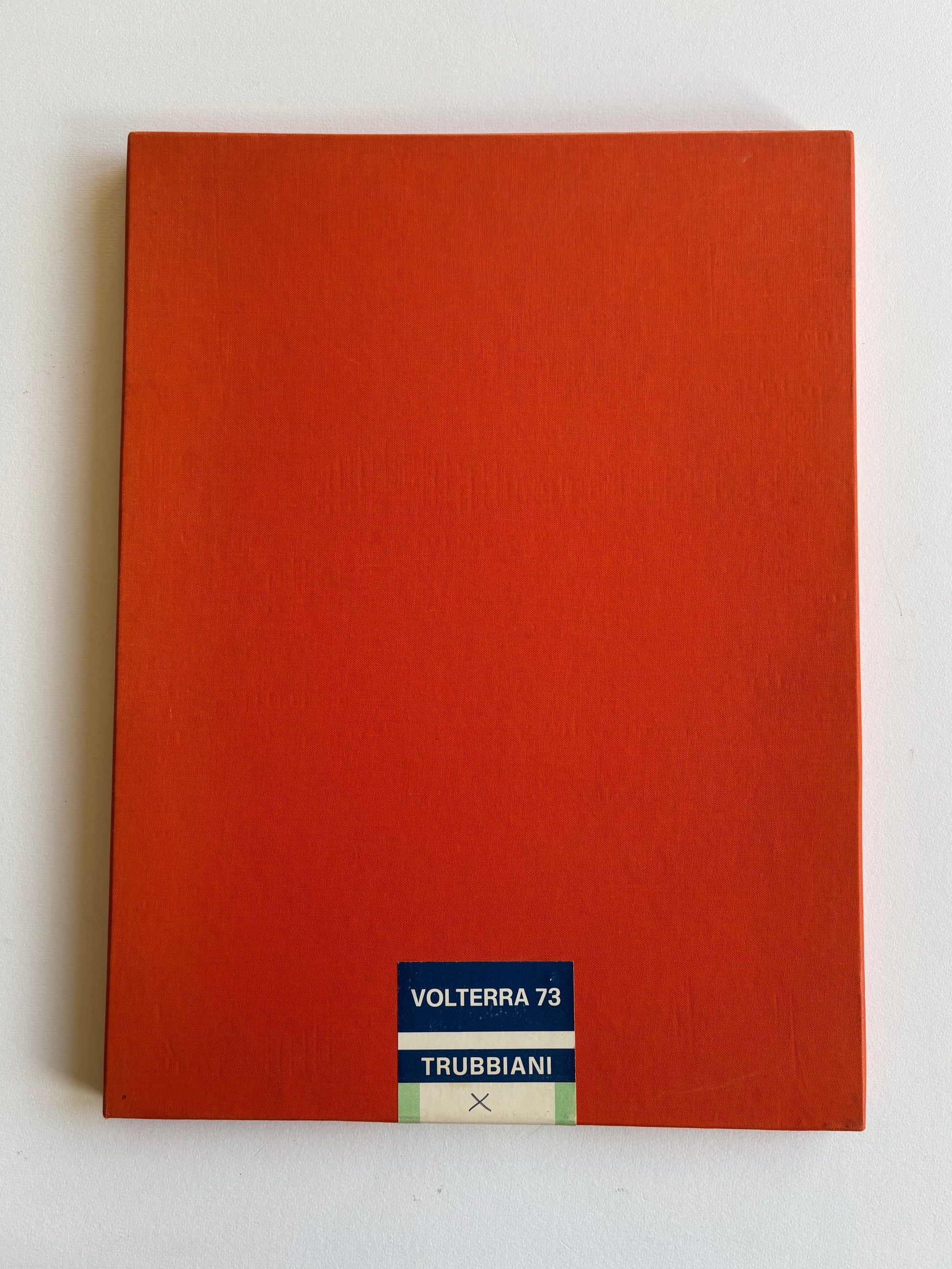 First edition. This is one of the 100, numbered and signed copies of the special edition with an original signed and numbered etching by Valeriano TRUBBIANI, and with in a loose folder images and text about a theatrical composition, by TRABBIANI, which was part of the art manifestation Volterra ‘73 from July 15 to September 15 in Volterra (Italy), and was “constructed” just in front of the wall of the Torre del Porcellino. 31 (+ one printed) loose photographs of this “constructed” wall in 1973, a reportage by Enrico CATTANEO (1933- 2019). Edited by Enrico Crispolti. Texts by Giuseppe Marchiori and a little text by Valeriano TRUBBIANI.